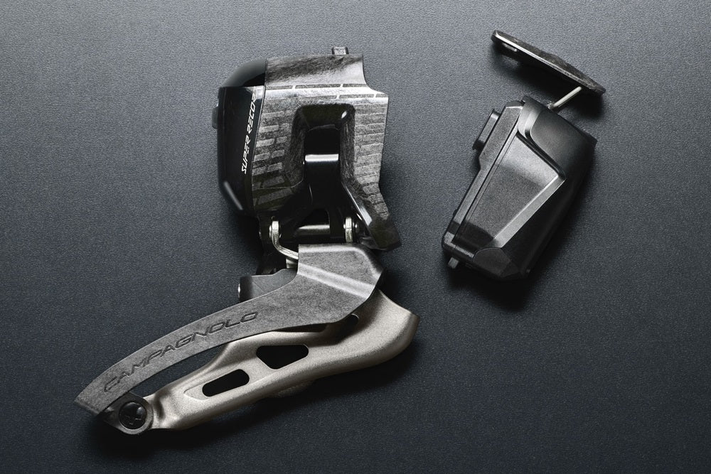 SUPER RECORD 13 FRONT DERAILLEUR The engineering design managed to achieve a significant weight reduction thanks to the use of high-quality materials and a new construction geometry. The carbon fork and its interaction system with the derailleur body ensures the use of a wide range of chainrings, from the super compact 45/29 configuration up to 55/39, ensuring full compatibility with all seven available gear combinations. The system is powered by a front-mounted battery capable of a battery life of up to 750 km on paved roads — a figure confirmed by tests conducted during the training camps of the Team World Tour Cofidis. The batteries may be recharged directly on the bike or separately once removed. Thanks to the Quick-Snap magnetic ports, the cable is automatically positioned in the correct place. The system is compatible with any USB-C socket, using the supplied cable. The smart batteries also ensure recharging via smartphone (equipped with a USB-C port), which can be used as a charging powerbank in emergency situations. Thanks to the ultra-fast recharging mode, a full recharge can be obtained in 60 minutes, while 90% of the charge is reached in just 45 minutes. In case of need, a 10-minute recharge is enough to guarantee a range of approximately 100 km. The battery status can be monitored directly on the derailleur, thanks to an integrated LED, or via the dedicated MyCampy app or compatible bike computer. Another technical detail concerns the forward positioning of the battery: placed in the front part of the derailleur body, it provides more free space near the seat tube, thus allowing the mounting of tires with a wider section — a growing trend also in the high-performance road bike segment. In line with the stylistic excellence of the Campagnolo tradition, the design of the Super Record groupset achieved the integration of the linkage arm into the upper carbon fibre body. The graphics, made directly from the mould or laser engraved, enhance the minimal nature of the shapes and underline the quality of the materials used. The new SUPER RECORD 13 front derailleur represents a perfect synthesis between technology, performance and versatility, and has been designed to meet the needs of modern high-level cycling. SPECIFICATIONS