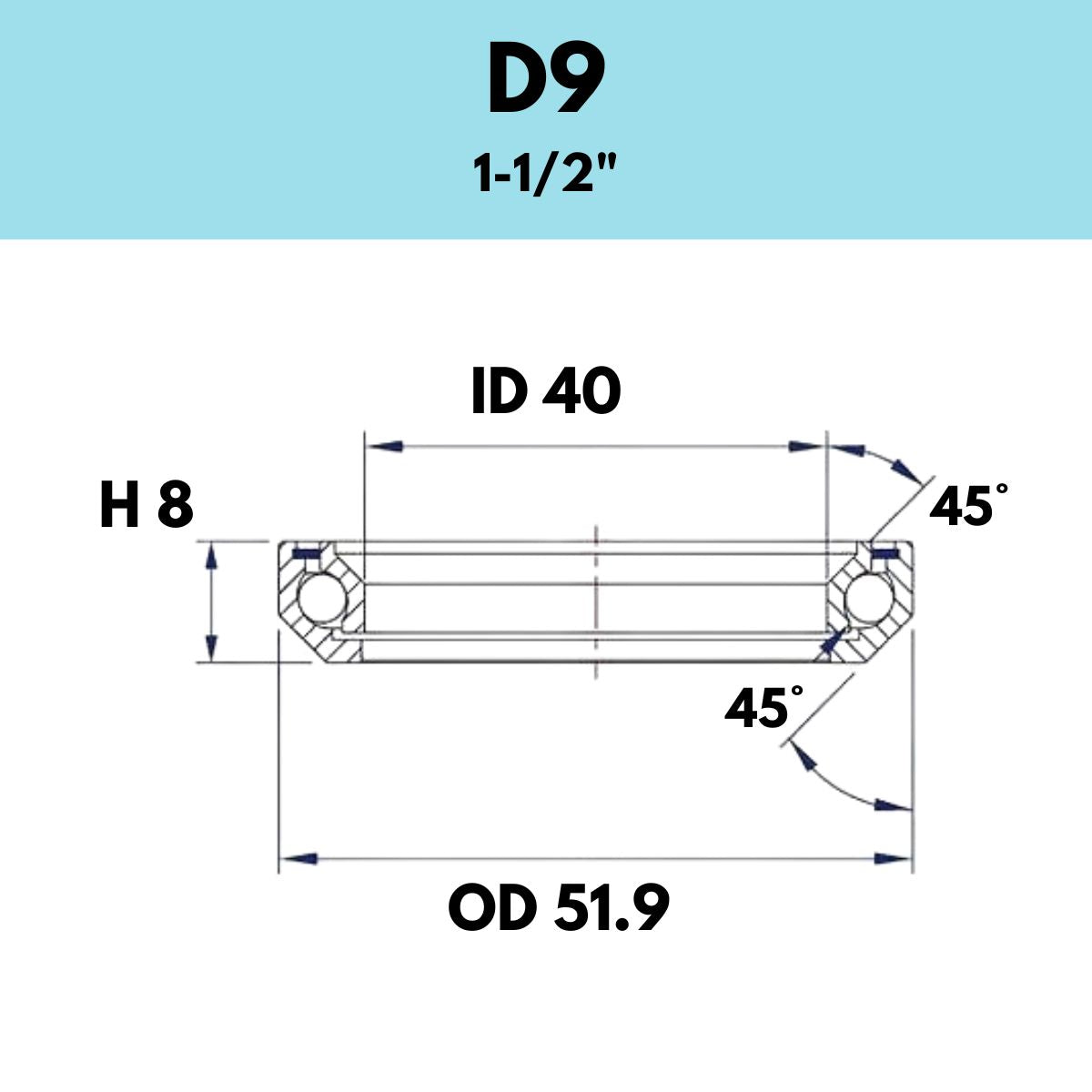 Black Bearing headset bearings are machined and assembled to precise tolerances. Please check precise measurements against the below to determine the correct size. SPECIFICATIONS STEERER DIAMETER: 1-1/2" OUTER DIAMETER: 51.9mm INNER DIAMETER: 40mm HEIGHT: 8mm CHAMFER ANGLES: 45°/45° Chrome steel balls SAE52100 Chrome steel races SAE52100 Premium quality grease