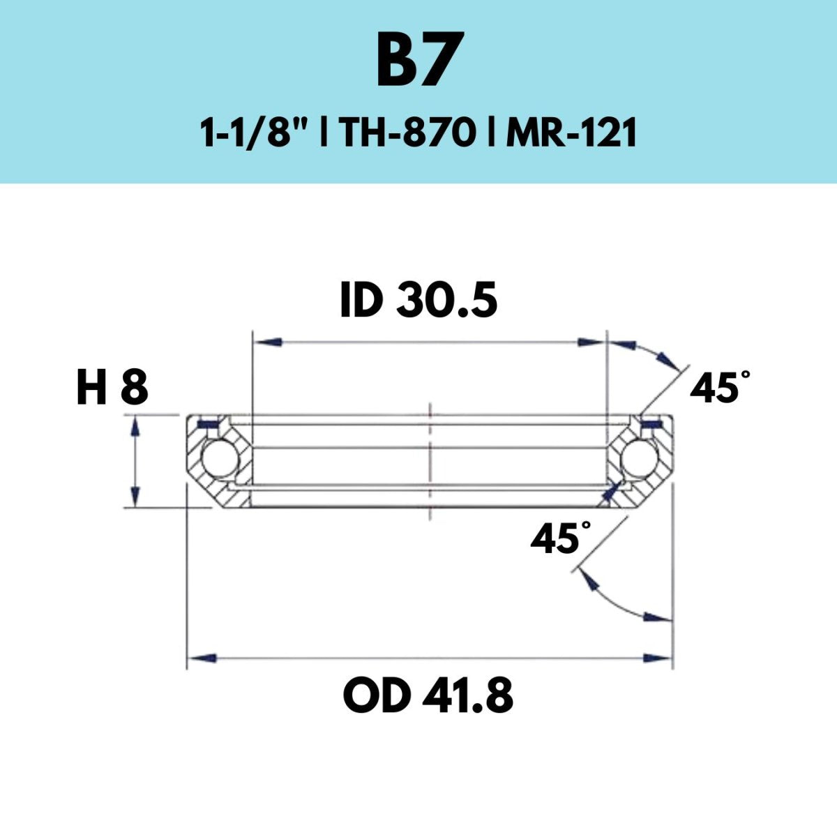 Black Bearing headset bearings are machined and assembled to precise tolerances. Please check precise measurements against the below to determine the correct size. SPECIFICATIONS STEERER DIAMETER: 1-1/8" OUTER DIAMETER: 41.8mm INNER DIAMETER: 30.15mm HEIGHT: 8mm CHAMFER ANGLES: 45°/45° Chrome steel balls SAE52100 Chrome steel races SAE52100 Premium quality grease Also referred to using the following part codes: TH-870, MR-121