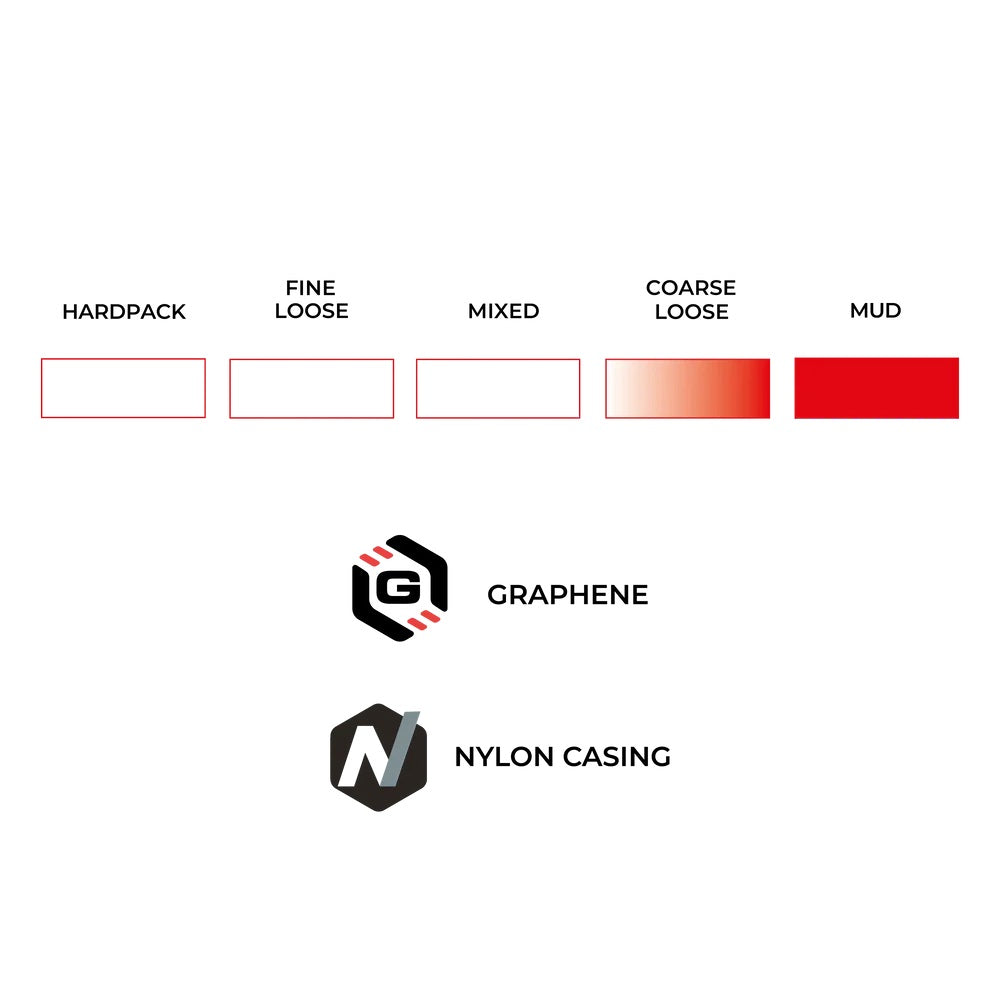 Many a battle has been lost, due to a lack of preparation. In Gravel and Cyclocross racing, having the right tires is often the critical difference between winning, and learning the hard way.When developing the Terreno Wet tread, we worked with the top athletes to gather their wish-list of performance traits that would make the ultimate wet weather weapon. Versatility was the common thread… It had to roll like a race tire, corner on rails, and be virtually clog proof. A tall order by any measure. The final product is a tread that performs unlike any other. With the open alternating-lugged design and full siping, the Terreno Wet delivers pro performance, in a range of soft terrain.