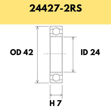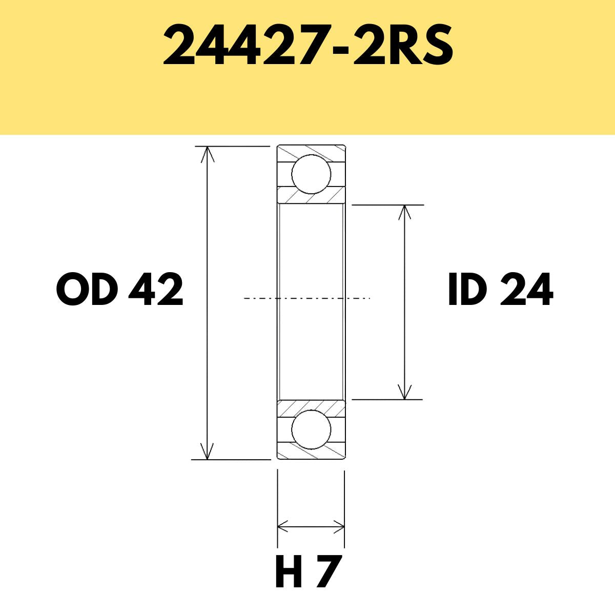 SPECIFICATIONS NAME: 24427-2RS OUTER DIAMETER: 42mm INNER DIAMETER: 24mm HEIGHT: 7mm Black Bearing radial bearings are machined and assembled to precise tolerances. They are offered in four material/build options to suit a broad range of applications at any budget. These bearings are best suited to components that undergo continuous rotation - think hubs, bottom brackets, or any part that spins. While they can be used in suspension pivots, the full-complement MAX versions are best suited to this application for optimum load management and longevity. B3 - CHROME STEEL B3 bearings are ABEC-3 grade and deliver reliable performance at a sharp price. The quality is comparable to the bearings that are typically specified as original equipment (OE) from many component manufacturers. Chrome steel balls - SAE52100 - ABEC-3 Chrome steel races - SAE52100 Chrome steel cage 2RS seals provide water and dust resistance Premium quality grease B5 - PREMIUM CHROME STEEL B5 Bearings are ABEC-5 grade. They will upgrade the performance of many stock bearings, rolling faster and smoother with exceptional durability. Chrome steel balls - SAE52100 - ABEC-5 Steel races - SAE52100 - with optmized internal design Chrome steel cage Reinforced 2RS seals for improved water and dust resistance Premium quality grease B5 STAINLESS - STAINLESS STEEL The bearing of choice for use in wet conditions. B5 Stainless bearings are highly corrosion-resistant, maintaining consistently smooth and fast performance under challenging conditions. Stainless steel balls - KS440 - ABEC-5 Stainless steel races - KS440 - with optmized internal design Steel cage - AISI-304 Reinforced 2RS seals for improved water and dust resistance Premium quality grease CERAMIC HYBRID Upgrade to Black Bearing Ceramic Hybrid bearings for ultimate performance. Premium silicon nitride balls have incredible durability and smoothness. These are precisely assembled into an ultra-low friction bearing unit optimised for competition and premium performance. Silicon nitride balls - SI3N4 Steel SAE52100 / Stainless steel KS440 races with optmized internal design Polyamide cage with low friction 2RS low-friction seals for fast rolling while providing water and dust resistance Premium quality grease