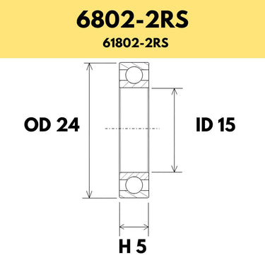 SPECIFICATIONS NAME: 6802-2RS / 61802-2RS OUTER DIAMETER: 24mm INNER DIAMETER: 15mm HEIGHT: 5mm Black Bearing radial bearings are machined and assembled to precise tolerances. They are offered in four material/build options to suit a broad range of applications at any budget. These bearings are best suited to components that undergo continuous rotation - think hubs, bottom brackets, or any part that spins. While they can be used in suspension pivots, the full-complement MAX versions are best suited to this application for optimum load management and longevity. B3 - CHROME STEEL B3 bearings are ABEC-3 grade and deliver reliable performance at a sharp price. The quality is comparable to the bearings that are typically specified as original equipment (OE) from many component manufacturers. Chrome steel balls - SAE52100 - ABEC-3 Chrome steel races - SAE52100 Chrome steel cage 2RS seals provide water and dust resistance Premium quality grease B5 - PREMIUM CHROME STEEL B5 Bearings are ABEC-5 grade. They will upgrade the performance of many stock bearings, rolling faster and smoother with exceptional durability. Chrome steel balls - SAE52100 - ABEC-5 Steel races - SAE52100 - with optmized internal design Chrome steel cage Reinforced 2RS seals for improved water and dust resistance Premium quality grease B5 STAINLESS - STAINLESS STEEL The bearing of choice for use in wet conditions. B5 Stainless bearings are highly corrosion-resistant, maintaining consistently smooth and fast performance under challenging conditions. Stainless steel balls - KS440 - ABEC-5 Stainless steel races - KS440 - with optmized internal design Steel cage - AISI-304 Reinforced 2RS seals for improved water and dust resistance Premium quality grease CERAMIC HYBRID Upgrade to Black Bearing Ceramic Hybrid bearings for ultimate performance. Premium silicon nitride balls have incredible durability and smoothness. These are precisely assembled into an ultra-low friction bearing unit optimised for competition and premium performance. Silicon nitride balls - SI3N4 Steel SAE52100 / Stainless steel KS440 races with optmized internal design Polyamide cage with low friction 2RS low-friction seals for fast rolling while providing water and dust resistance Premium quality grease