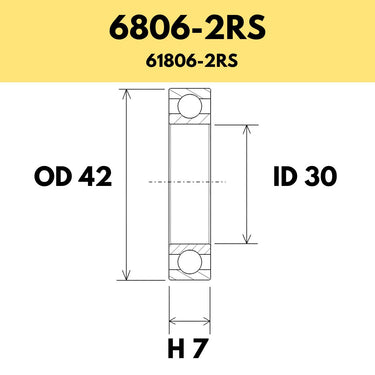 SPECIFICATIONS NAME: 6806-2RS / 61806-2RS OUTER DIAMETER: 42mm INNER DIAMETER: 30mm HEIGHT: 7mm Black Bearing radial bearings are machined and assembled to precise tolerances. They are offered in four material/build options to suit a broad range of applications at any budget. These bearings are best suited to components that undergo continuous rotation - think hubs, bottom brackets, or any part that spins. While they can be used in suspension pivots, the full-complement MAX versions are best suited to this application for optimum load management and longevity. B3 - CHROME STEEL B3 bearings are ABEC-3 grade and deliver reliable performance at a sharp price. The quality is comparable to the bearings that are typically specified as original equipment (OE) from many component manufacturers. Chrome steel balls - SAE52100 - ABEC-3 Chrome steel races - SAE52100 Chrome steel cage 2RS seals provide water and dust resistance Premium quality grease B5 - PREMIUM CHROME STEEL B5 Bearings are ABEC-5 grade. They will upgrade the performance of many stock bearings, rolling faster and smoother with exceptional durability. Chrome steel balls - SAE52100 - ABEC-5 Steel races - SAE52100 - with optmized internal design Chrome steel cage Reinforced 2RS seals for improved water and dust resistance Premium quality grease B5 STAINLESS - STAINLESS STEEL The bearing of choice for use in wet conditions. B5 Stainless bearings are highly corrosion-resistant, maintaining consistently smooth and fast performance under challenging conditions. Stainless steel balls - KS440 - ABEC-5 Stainless steel races - KS440 - with optmized internal design Steel cage - AISI-304 Reinforced 2RS seals for improved water and dust resistance Premium quality grease CERAMIC HYBRID Upgrade to Black Bearing Ceramic Hybrid bearings for ultimate performance. Premium silicon nitride balls have incredible durability and smoothness. These are precisely assembled into an ultra-low friction bearing unit optimised for competition and premium performance. Silicon nitride balls - SI3N4 Steel SAE52100 / Stainless steel KS440 races with optmized internal design Polyamide cage with low friction 2RS low-friction seals for fast rolling while providing water and dust resistance Premium quality grease