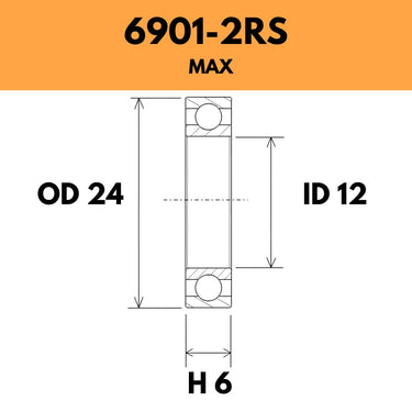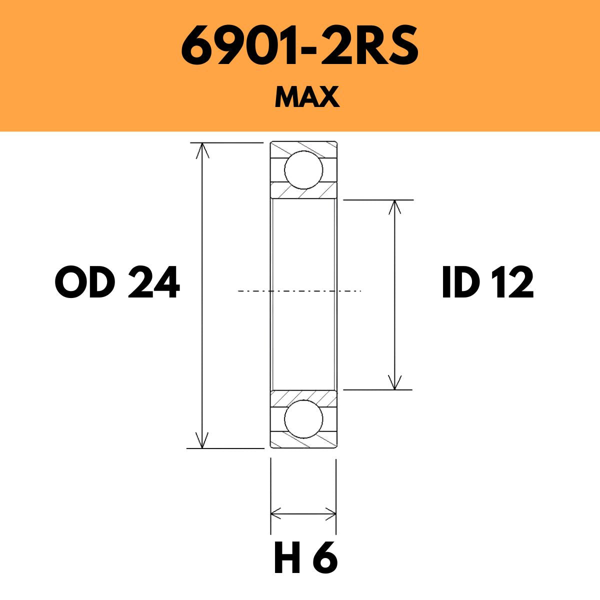 SPECIFICATIONS NAME: 6901-2RS MAX / 61901-2RS MAX OUTER DIAMETER: 24mm INNER DIAMETER: 12mm HEIGHT: 6mm Black Bearing radial bearings are machined and assembled to precise tolerances. MAX bearings are specifically designed for frame pivots. They use full complement bearings without retainers and have a high fill rate of premium grease, ensuring optimum load management and longevity when used in this application. They are approximately 40% stronger than their standard radial counterparts. Please note MAX bearings are only suitable for reciprocating movement, and should not be used in components that undergo continuous rotation (hubs, bottom brackets, or any part that spins). Please select the B3 / B5 / B5S / Ceramic non-MAX versions of these bearings for this purpose. SPECIFICATIONS Chrome steel balls - SAE52100 - ABEC-3 Chrome steel races - SAE52100 No inner retainer - full complement bearing 2RS seals provide water and dust resistance Premium quality grease with high fill rate ~40% stronger than standard radial bearings Use only in frame pivots