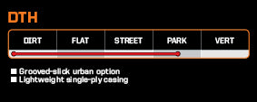 The grooved slick design of the Maxxis DTH (Drop the Hammer) is suited to a variety of BMX, dirt jumping, and pump track situations.
