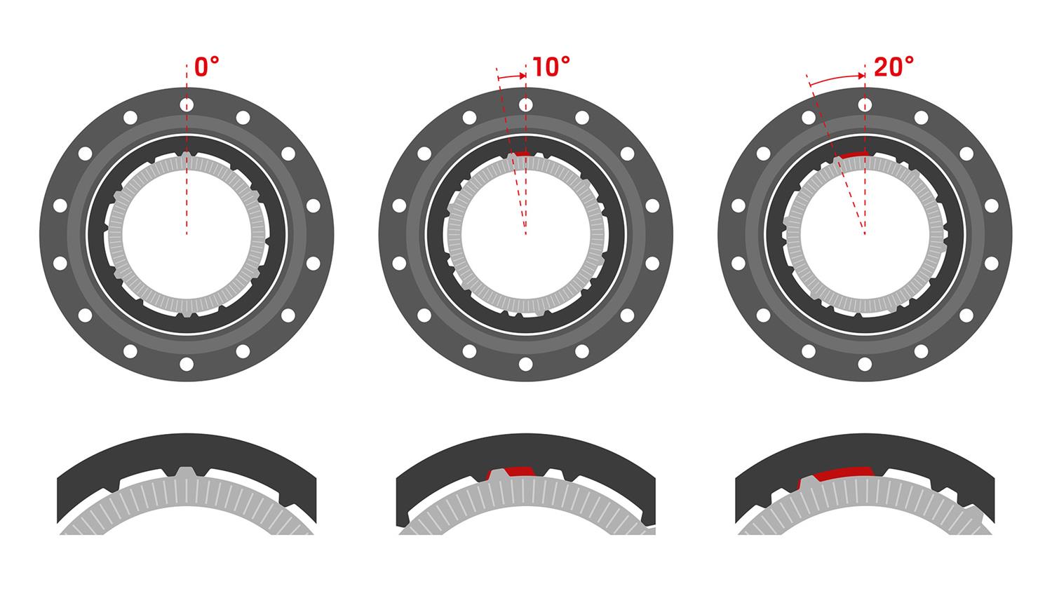 The new DF technology will be available soon for eMTB. Due to the higher torques in this specific field of use, the degrees of freehub movement are 0° or 10°. The technology will be available in Ratchet DEG Hybrid hubs featuring ratchets with 60 teeth.