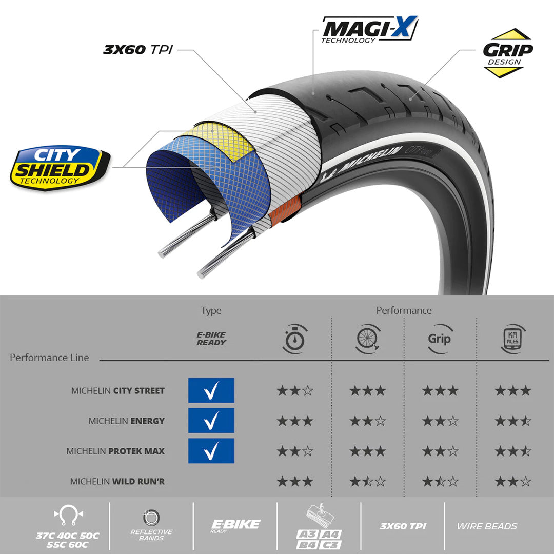 The Michelin City Street Performance Line is a urban bicycle tyre designed to provide riders with maximum grip in all year round, in various weather conditions and with superior puncture protection thanks to the reinforced casing across the tyre. Additionally, this tyre is suitable for e-bike use.