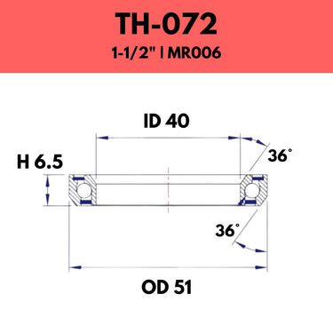 Please check precise measurements against the below to determine the correct size. SPECIFICATIONS STEERER DIAMETER: 1-1/2" OUTER DIAMETER: 51mm INNER DIAMETER: 40mm HEIGHT: 6.5mm CHAMFER ANGLES: 36°/36° TH-072E Chrome steel balls and races Also known as part code MR-006. Black Bearing equivalent is bearing D11