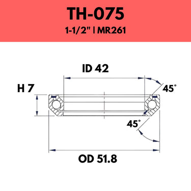 Please check precise measurements against the below to determine the correct size. SPECIFICATIONS STEERER DIAMETER: 1-1/2" (found in some 1 1/8" steerer uppers using internal routing) OUTER DIAMETER: 51.8mm INNER DIAMETER: 42mm HEIGHT: 7mm CHAMFER ANGLES: 45°/45° TH-075E - uses chrome steel balls and races Also known as part code MR-261. Found in some internally routed headset systems - notably FSA SRS models.