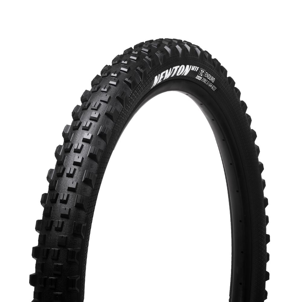 A tyre that feels most at home riding up front while smashing turns, holding grip on off-camber sections, finding that last bit of traction on wet roots, dusty rocks & nasty turns. Progressive block layout limits dirt buildup maintaining performance across a wide range of conditions. From aggressive trail riding to the demands of downhill racing, the Newton MTF delivers consistent cornering bite, predictable braking control and premium performance in ever-changing conditions. The tread design features ramped center knobs to reduce rolling resistance, while tall, arch-supported side knobs provide fierce braking and cornering grip. The profile of the Newton range is inspired by the motocross (MX) world. By utilizing a rounder profile for the Newton MTF (front), damping capacity is increased and the tyre footprint is elongated; in the real world, this offers improved straight-line control while providing a greater contact patch for braking. The Newton MTR (rear) maintains a squarer profile and is paired with uniform, closely spaced outer knobs. The tyre’s wider footprint offers greater drive traction and confidence inspiring transition between center tread to side knobs. Available in Trail, Enduro and Downhill specific casing layups. Each casing layup is then paired with multi-durometer compounds developed specifically for the tire’s intended application and front / rear use. The large block tread design of the Newton MTF is optimized for straight-line control, cornering confidence and effective braking. Progressive block layout limits dirt buildup, maintaining performance across a wide range of conditions. The Newton MTF Enduro features our new Dynamic Grip3S compound, a front-specific, triple density 40/42/60a compound offering the ultimate level of grip and slow rebound properties. The dual-ply, 120TPI construction casing is supple and fast rolling, with improved traction while providing high levels of support and puncture resistance. A butyl sidewall layer provides abrasion and cut defense while providing additional sidewall support. Weight: 1182g (27.5 x 2.5) The Story The Goodyear name first appeared on a tyre — a bicycle tyre, to be precise — in 1898. Since then, Goodyear and the legendary Winged Foot™ logo have been synonymous with victory, dominating the winner’s circle across the entire spectrum of motorsports. Goodyear tyres have shouldered heavy-duty work on everything from airplanes to Zambonis. They’ve rolled on the moon and have helped steer millions of motorists along their journeys. Now, 120 years after Goodyear's original offering, we welcome a new line of performance bicycle tyres. Developed with Rubber Kinetics, the Goodyear line utilizes refined compounds and casings, each purpose-built for their intended environments.
