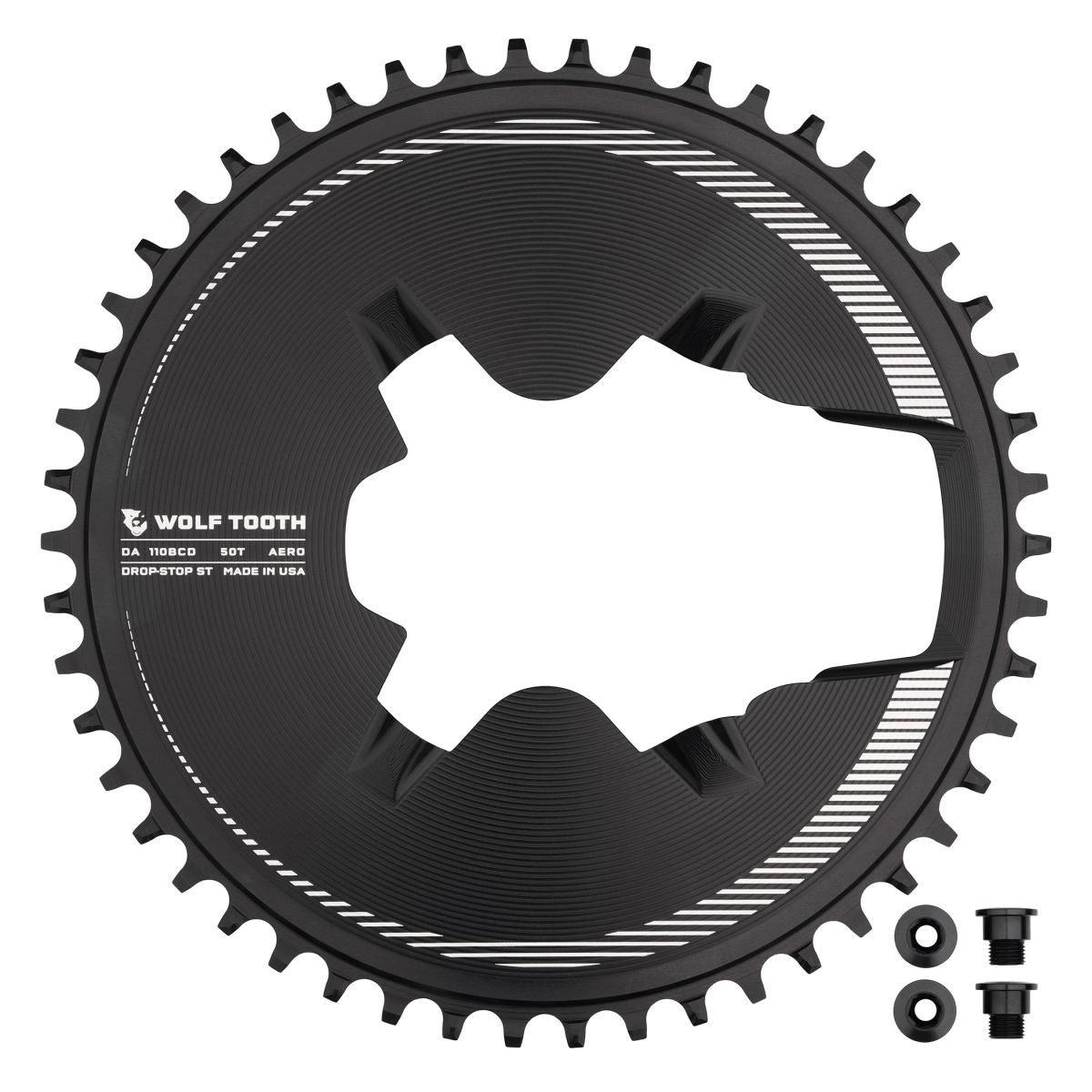 New Wolf Tooth Aero Direct Mount Chainrings for Shimano Dura-Ace R9200 Cranks are optimized for all-terrain racing and the pursuit of speed. These are compatible only with R9200 cranks. They are available in larger 46, 48, and 50T sizes to complement modern wide-range 1x setups and provide similar gearing range to standard 2x drivetrains. This new chainring expands the range of dedicated Wolf Tooth aero chainrings for gravel and road racing. Wolf Tooth aero chainrings are strong, lightweight, and profiled to mate perfectly with the crankset for a clean, integrated look. They feature our patented Drop-Stop® ST tooth profile optimized for the Shimano 12-speed Hyperglide+ chain for ultimate performance, chain retention, efficiency, and durability. Available in sizes 46, 48, and 50T Compatible with Shimano R9200 cranks (FC-R9200 and FC-R9200-P) NOT compatible with Ultegra R8100, 105 R7100, or any other Shimano cranks Patented Drop-Stop wide/narrow tooth profile provides ultimate chain retention, efficiency, and durability Drop-Stop ST tooth profile is optimized for Shimano 12-speed Hyperglide+ chains Designed for 1x drivetrains only; not compatible with 2x drivetrains Four rear-loading mounting bolts are included Machined at Wolf Tooth in Minnesota, USA DROP-STOP TECHNOLOGY Wolf Tooth’s patented Drop-Stop® wide/narrow tooth profile delivers ultimate chain retention and mud shedding ability.