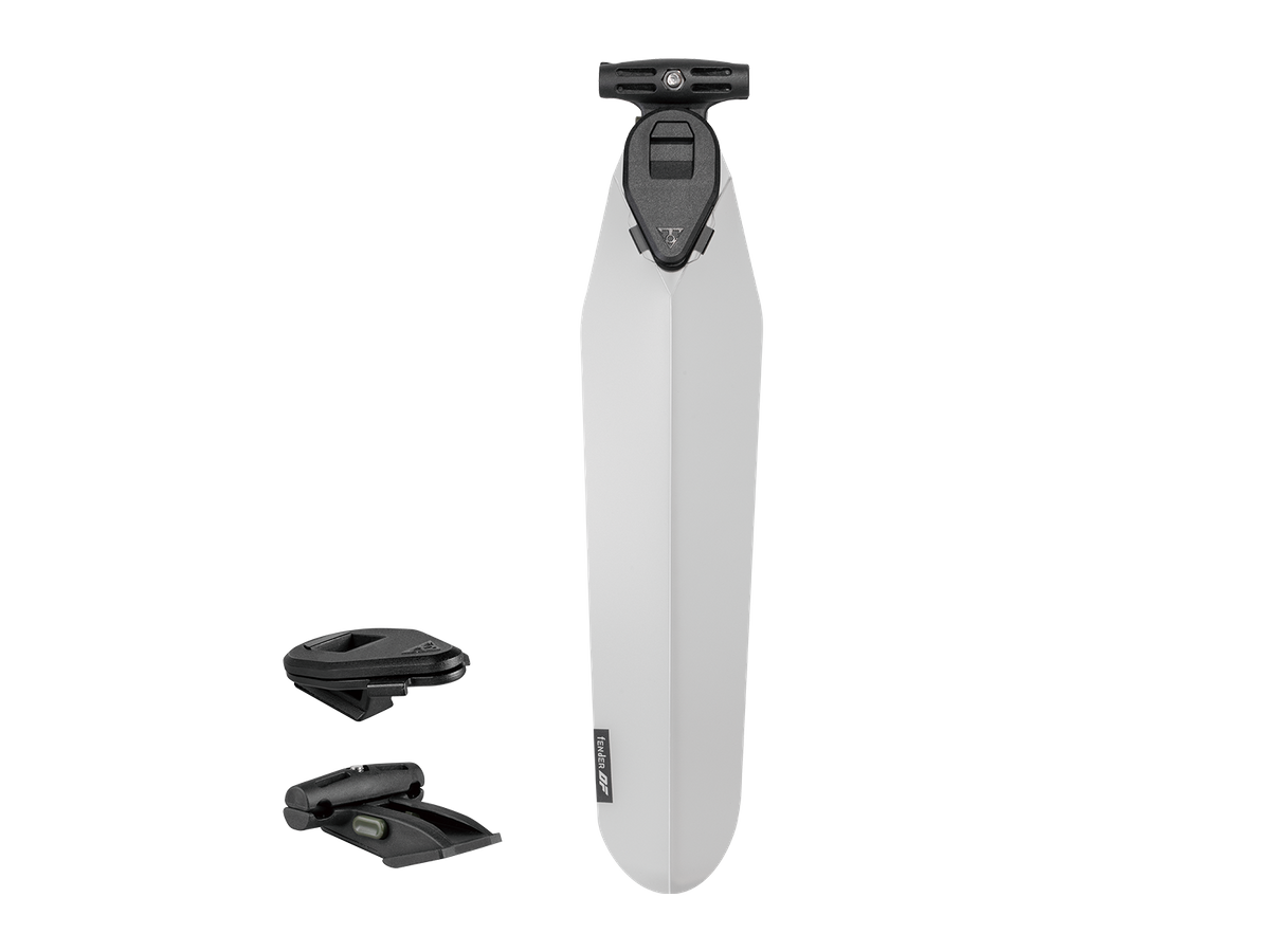 Durable polypropylene fender is ultralight, stylish, and simple to slide and click then ready to go when wet weather arrives. Included Duo Fixer allows fast and easy tool-free mounting and removal and provides dual use with Topeak Duo Fixer system accessories, including Topeak QuickClick saddle bags or most strap type saddle bags, Tubi tools, CO2 inflators, and lights underneath the saddle. Black and transparent colors with exchangeable upper and lower backets as a set for the color options and mounting position option to suit different needs.