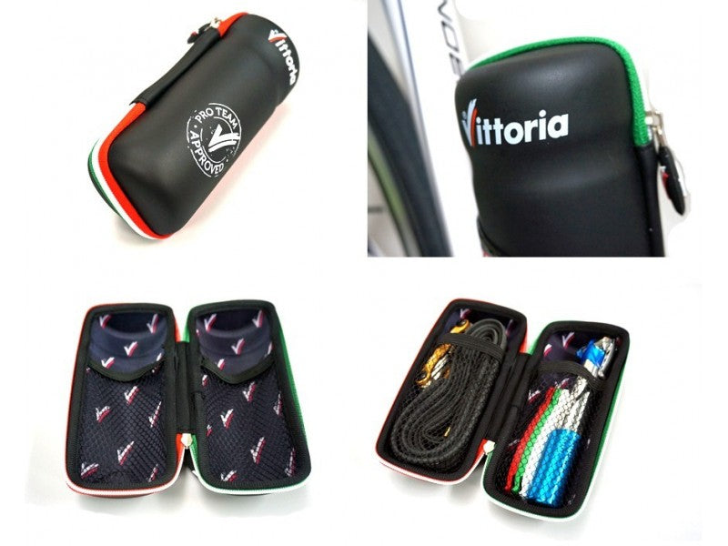 Italian-designed zip case for your repair kit, handy tool and money. Fits into a normal bottle cage and folds open flat for easy access. Black in color, with the Italian flag colors for the edging. A perfect complement to any high-end road bike.
