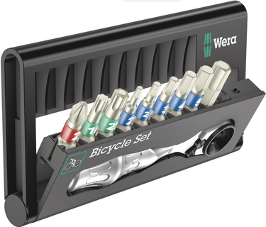 A lot of bicycle tools in a small space. The sorting of the 9 stainless steel bits by profile and size allows quick access to the right tool. With one Wera Zyklop Mini 1 bit ratchet in a drop-forged solid steel design. The fine toothing mechanism with 60 teeth allows a small return angle of 6° for precise working. The knurl allows fast screwdriving in cramped situations, when there is no space for ratcheting. Easy left/right switching. Ergonomically shaped ratchet head and lever. With Take it easy tool finder with colour coding by size - to help you find the required tool quickly and easily.